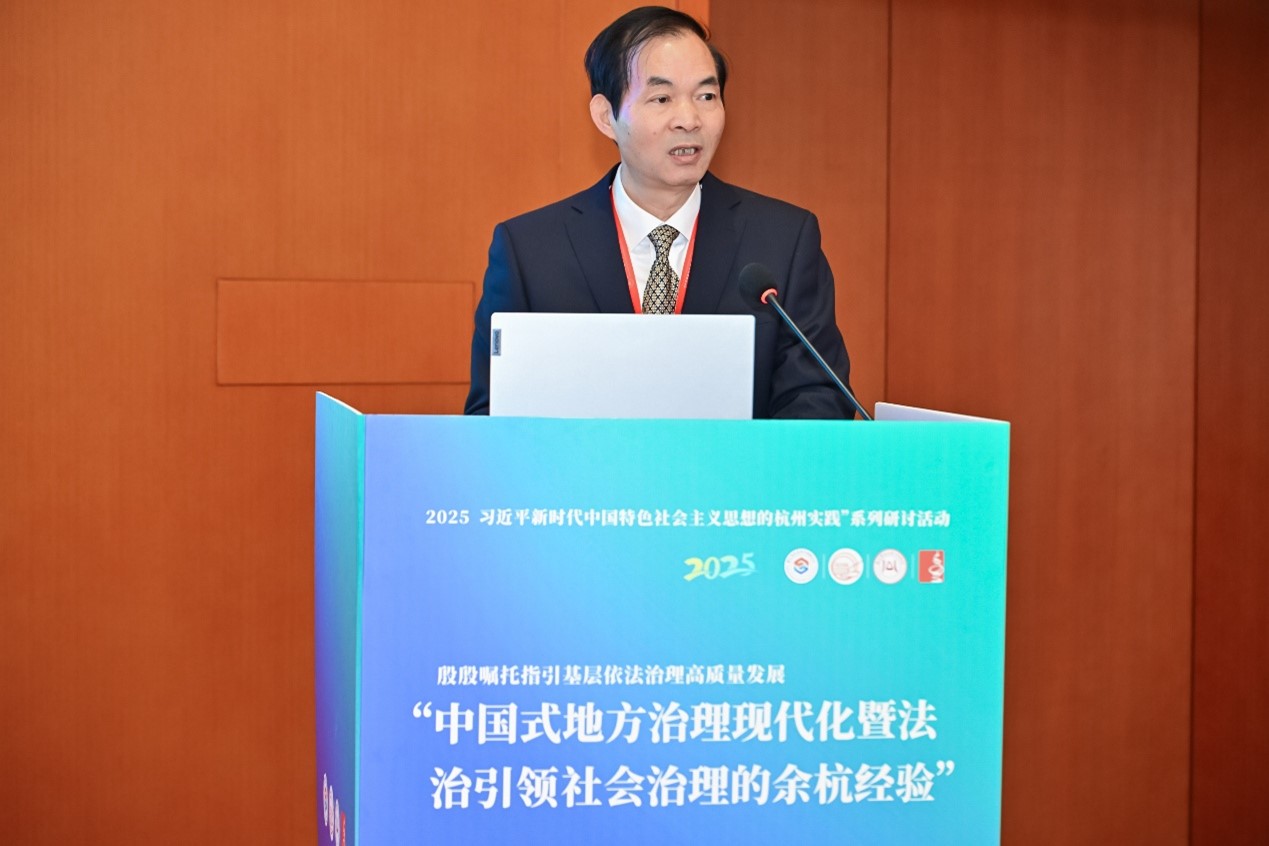 周国如在致辞中指出,习近平总书记在浙江工作时作出的重要指示,为法治浙江建设和基层治理指明方向。杭州市、余杭区始终践行习近平总书记的殷殷嘱托,推动法治建设与各项事业深度融合,积累了宝贵的实践经验。同时他提出三点期望:一是紧紧围绕习近平新时代中国特色社会主义思想的杭州实践,深化理论研究,持续深化循迹溯源研究;二是强化实践服务,希望专家学者聚焦基层治理重点与难点,探究新场景、新问题、新技术,贡献可复制、可操作的治理方案;三是加强智库建设,发挥高校平台优势,推动学科协同创新与研究范式变革。